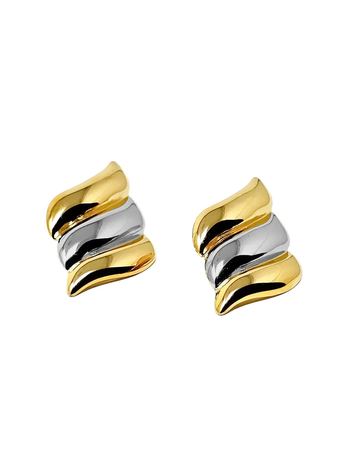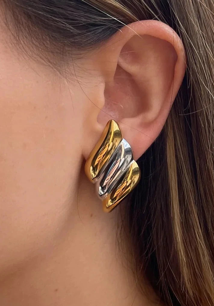 Orecchini dal design ondulato bicolore oro e argento, perfetti per chi ama lo stile moderno e sofisticato. Le onde fluide creano un gioco di luce e contrasti che impreziosisce ogni look.